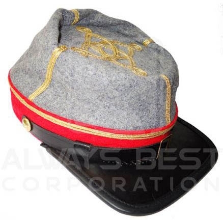 CS OFFICER KEPI GREY WITH RED BAND WITH 2 ROW GOLD BRAIDS WITH 2 CSA SMALL BRASS BUTTONS & WITH LEATHER BAND & PIPING PICK SIZES S,M,L,XL & XXL