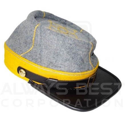 CS CAVALRY OFFICER KEPI GREY WITH YELLOW BAND WITH 1 ROW GOLD BRAID WITH 2 CSA SMALL BRASS BUTTONS & WITH LEATHER BAND & PIPING PICK SIZES S,M,L,XL & XXL